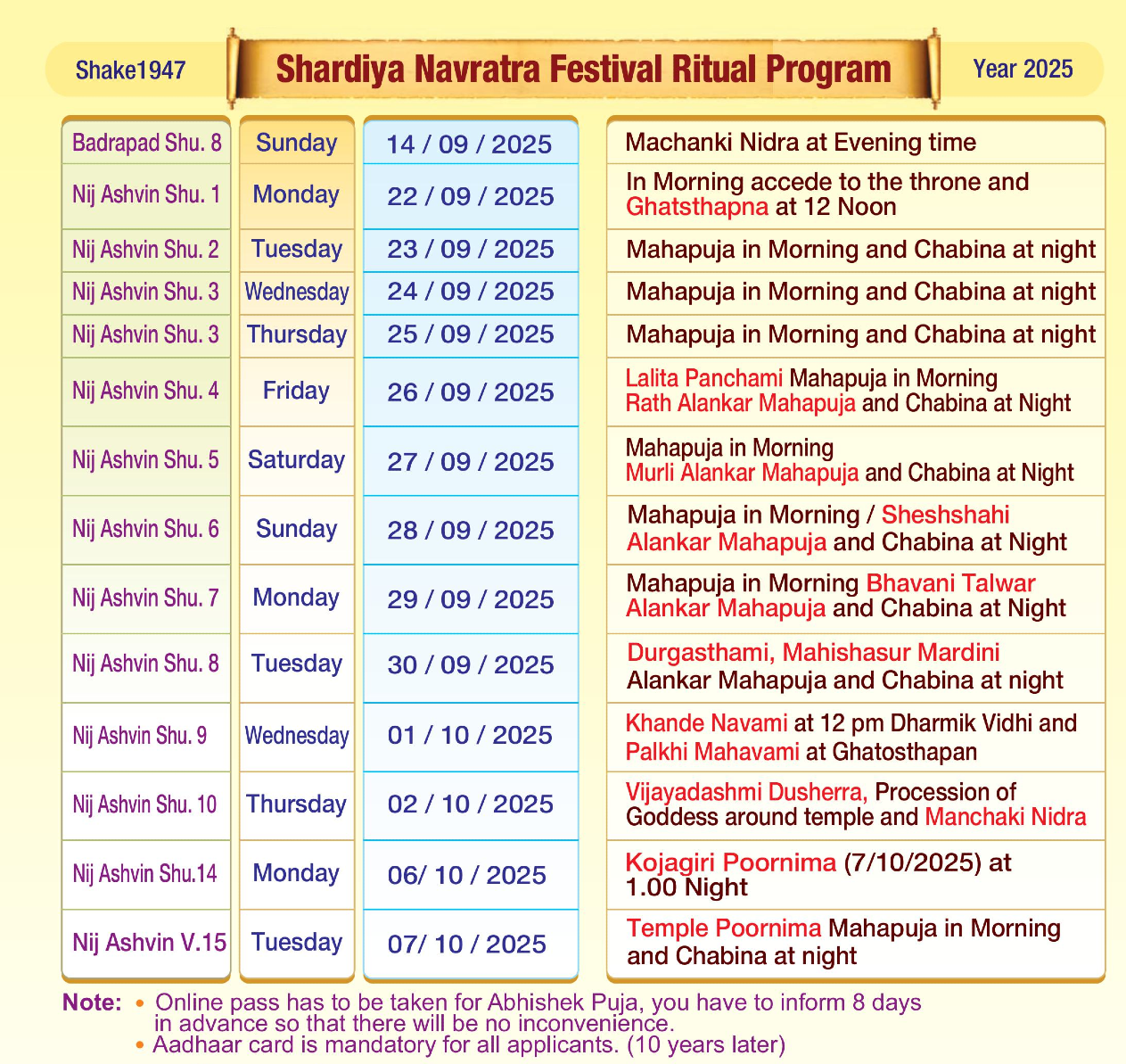 We are happy to invite you that Navratri Festival is going to happen from 22/09/2025 to 02/10/2025. We request your presence on this very auspecious festival to get blessed from Lord Shri Tulja Bhavani mata. The detailed schedule of navratri is attached to this post.Those devotee, who want to offer Seva during navratri festival , they can avail our ePrasad facility by registering your offering at below website.Your navratri ePrasad will be delivered to your home after Pournima.