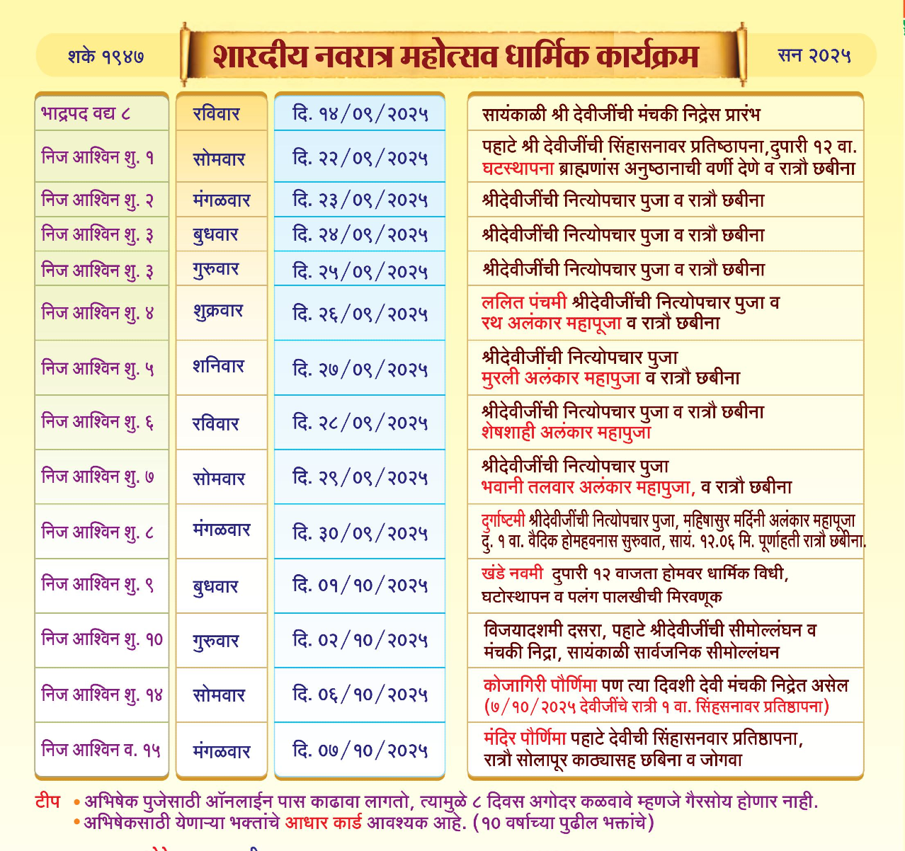 We are happy to invite you that Navratri Festival is going to happen from 22/09/2025 to 02/10/2025. We request your presence on this very auspecious festival to get blessed from Lord Shri Tulja Bhavani mata. The detailed schedule of navratri is attached to this post.Those devotee, who want to offer Seva during navratri festival , they can avail our ePrasad facility by registering your offering at below website.Your navratri ePrasad will be delivered to your home after Pournima.